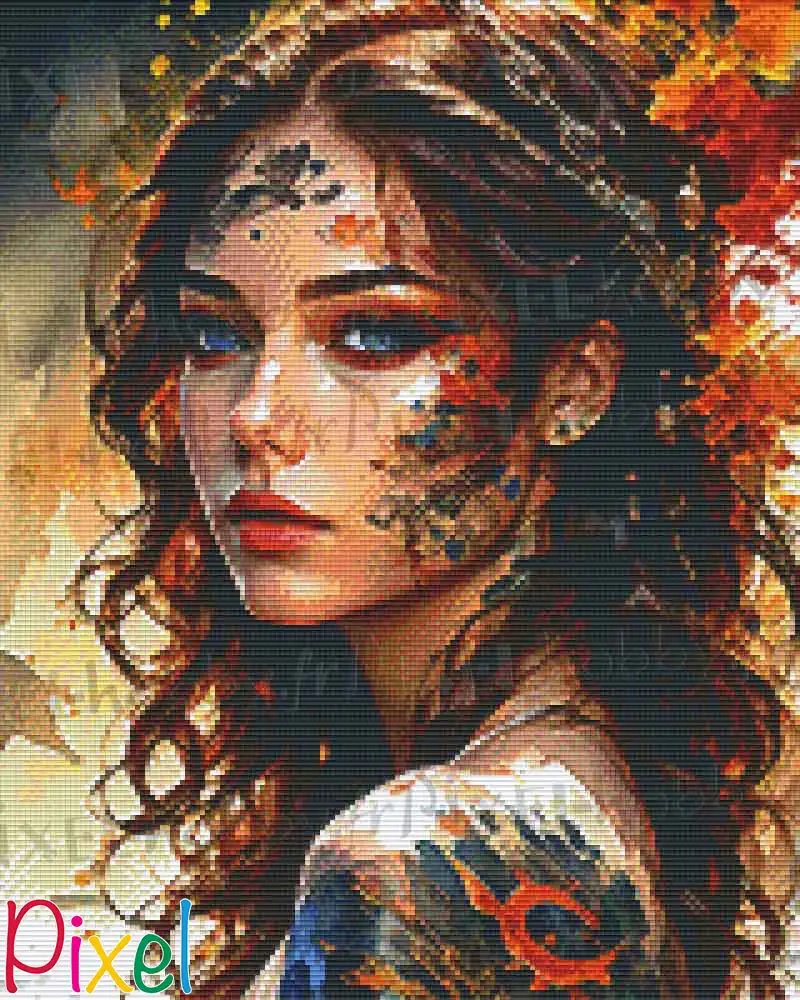Ô, jeune femme énigmatique, émerge des profondeurs de l'océan avec une grâce irrésistible. Ses longs cheveux bouclés retombent en cascades autour d'elle. Les algues oranges entrelacées dans ses cheveux semblent fusionner avec sa nature sauvage et indomptable. Son visage est marqué par des tatouages abstraits d'un bleu profond et d'un orange flamboyant, symboles de son lien étroit avec la mer.