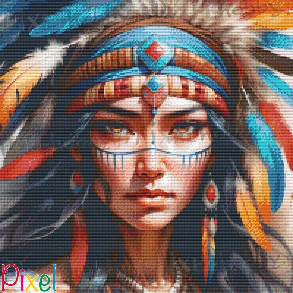 Ce portrait représente la force, la résilience et la beauté intemporelle des peuples autochtones. L'Amérindienne est ici un gardien de la tradition et une ambassadrice de la culture amérindienne, prête à transmettre son savoir et sa sagesse aux générations futures.