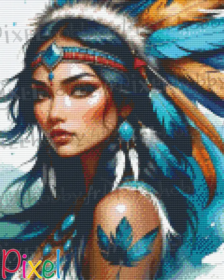 Sa coiffe ornée de plumes turquoise et brunes lui confère une aura de mystère et de sagesse ancestrale.