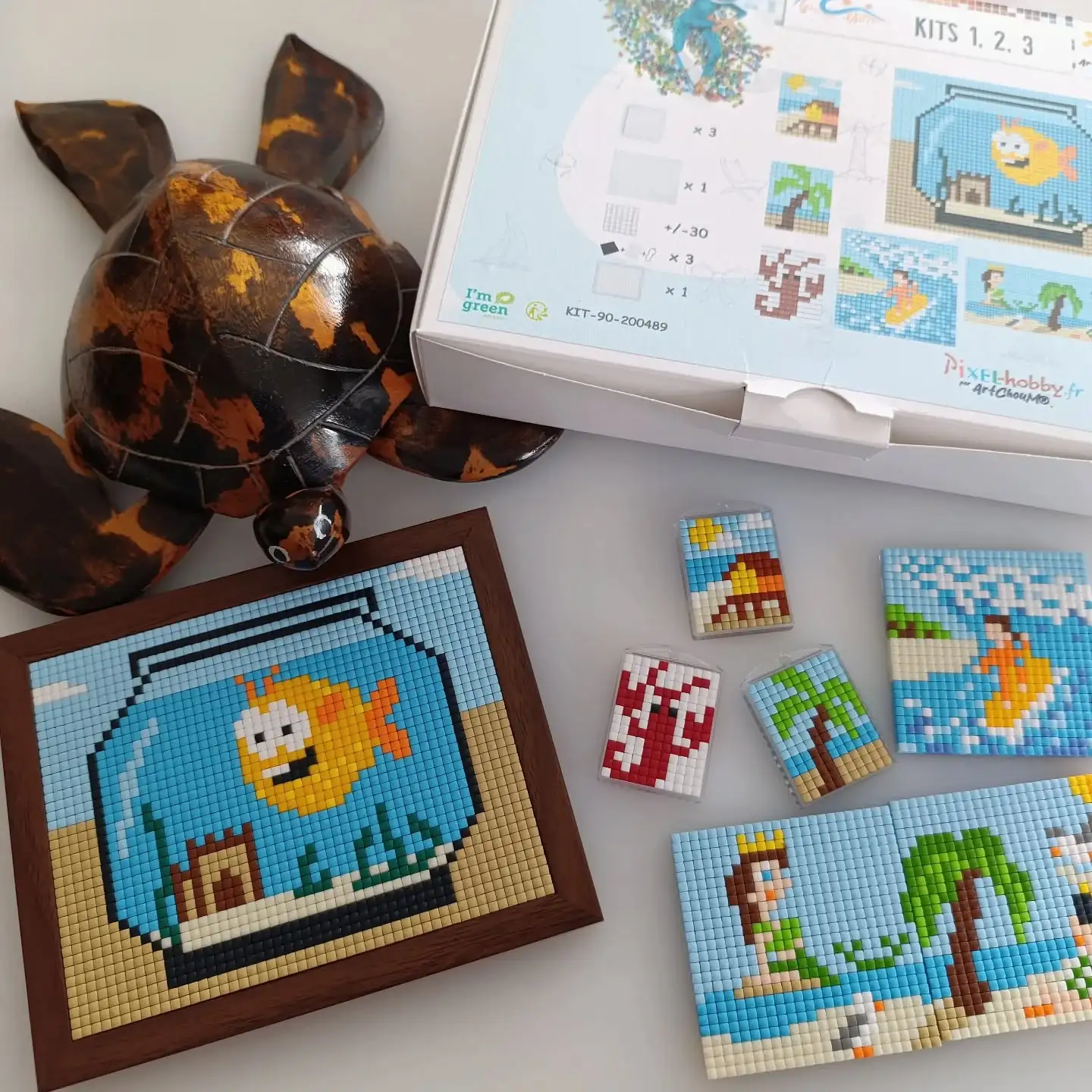 Boite d'activité permettant de réaliser: 1 tableau (environ 10 x12cm) en pixel, 3 magnets et 3 médaillons.