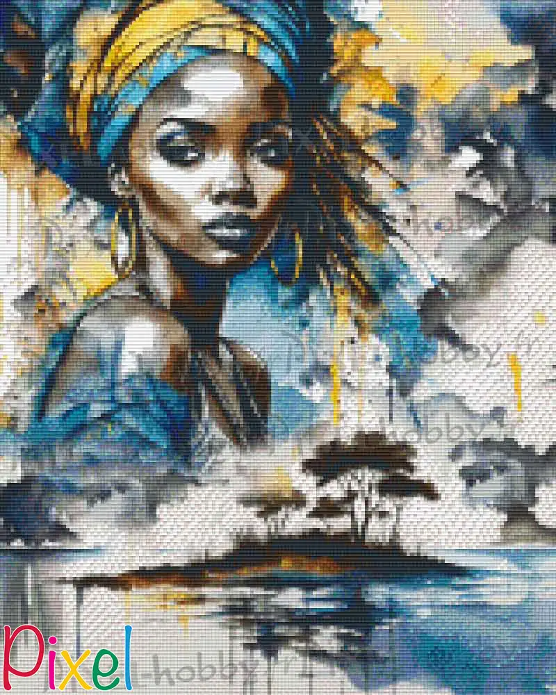 Le portrait de la femme africaine est le point central de l'illustration, sa beauté et son regard rêveur captivent l'attention. Le turban turquoise et jaune ainsi que les boucles d'oreilles dorées ajoutent une touche d'élégance et de mystère à son apparence.