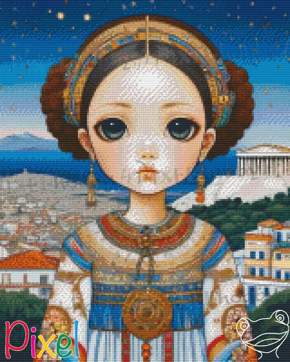 Laissez-vous transporter en Grèce grâce à notre poupette, vêtue d'un habit traditionnel, qui se tient fièrement devant la ville d'Athènes.