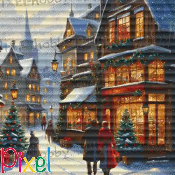 C'est la veille de Noël, et la communauté est en émoi. Les personnages représentés sont une mère, un père et leur jeune fils, se rendant sur la place principale du village pour le marché de Noël. Le père, revêtu de son élégant manteau gris, tient le bras de sa femme vêtue de rouge vif, symbolisant la joie et l'amour familial.