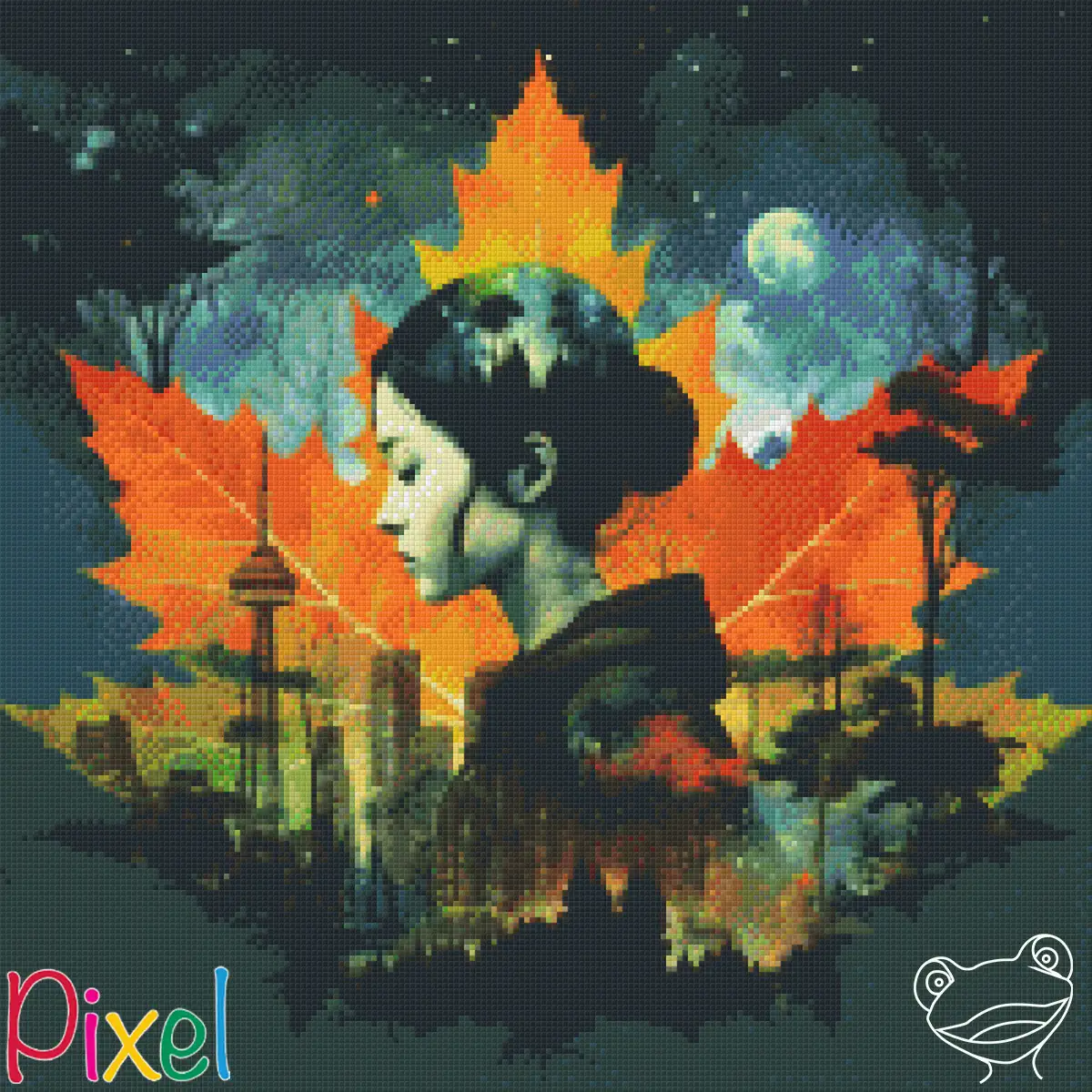 À l’intérieur de la feuille d’érable, le contraste des couleurs est saisissant : des teintes chaudes évoquant la lumière du jour ou la chaleur de l’été, tandis qu’à l’extérieur, une scène nocturne se déploie.