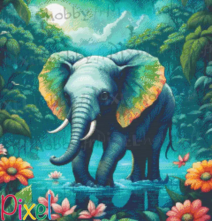 Dans ce tableau, les fleurs aux teintes orange et rose qui bordent le lac accentuent encore plus cette atmosphère de bien-être. Elles contrastent délicatement avec le gris de l'éléphant et les verts des montagnes, créant un tableau vivant et apaisant. L'éléphant, symbole de sagesse et de mémoire, semble être à l'écoute de son environnement, réceptif aux murmures de la nature.