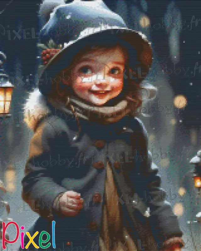 Elle est vêtue d'un ensemble d'habits d'hiver. Son regard, avec ses yeux bleu-verts qui scintillent de lumière douce, crée une connexion émotionnelle instantanée avec le spectateur. Son sourire lumineux et ses joues rosies suggèrent une joie innocente, typique des plaisirs simples de l'hiver.