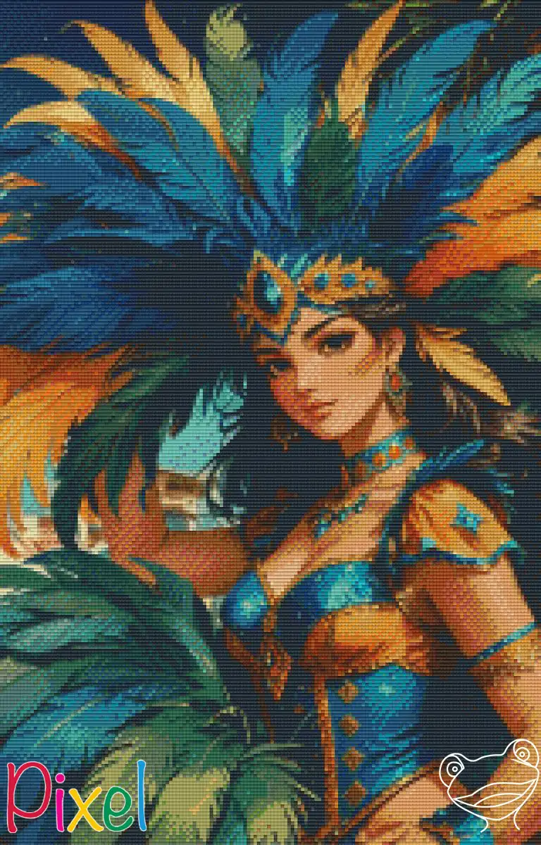 Cette illustration capture l’énergie, la diversité des couleurs et l’esprit joyeux du Carnaval de Rio, tout en mettant en valeur le patrimoine culturel brésilien à travers ses costumes flamboyants et ses accessoires élaborés.