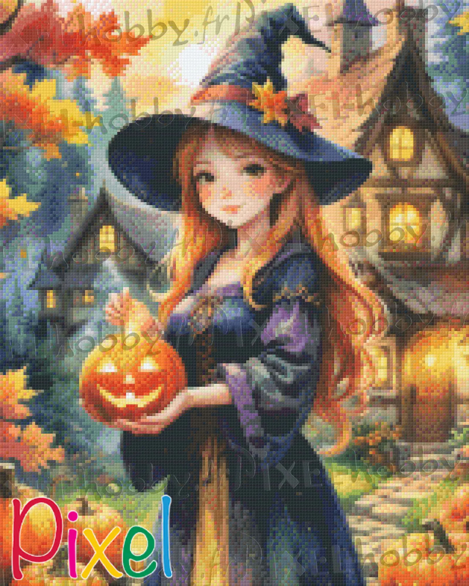 Sa chevelure flamboyante et sauvage contraste avec sa longue robe violette, qui est ornée d'accents orange, créant une harmonie avec sa tenue. Elle porte un chapeau, également violet, ajoute une touche classique au personnage et est décoré d'un ruban orange qui s'aligne avec ses choix de couleurs. Enfin, les deux feuilles automnales accrochées au ruban renforcent l'ambiance de la saison et la connexion de la sorcière avec la nature.