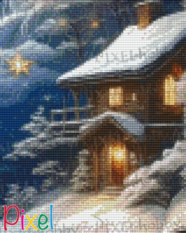 La combinaison de bleus, de blancs et de gris froids crée une atmosphère hivernale, tandis que les touches chaudes et dorées des étoiles et des lumières des fenêtres du chalet ajoutent de la profondeur et de la chaleur à la composition. Cela accentue le contraste entre le froid de l'hiver et la chaleur des souvenirs ou des lieux réconfortants. Le chalet est un élément très important de l'ensemble. Il représente la maison familiale, perdu dans la nature, où chaque année la famille se réunit pour fêter Noël. Vous apercevez la lumière qui s'échappe par la fenêtre ? Rapprochez-vous, encore, voyez vous le grand sapin tout décoré qui trône au milieu du salon, les nombreux cadeaux à ses pieds ? Des enfants tournent autour, essayant de deviner ce qui se cache dans leur cadeau. Les adultes discutent, parfois un peu fort, tout en préparant la table du réveillon. Un feu de cheminée réchauffe l'atmosphère. Toute la famille est réunie.