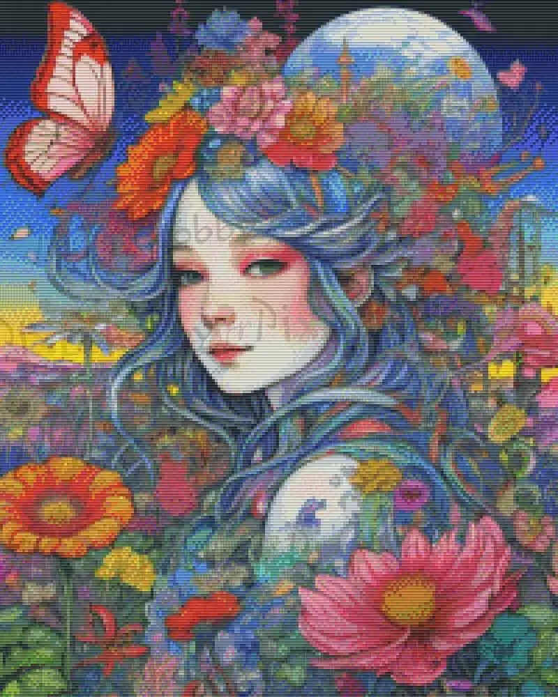 L'image de la jeune fille au milieu des fleurs est un mélange de surréalisme et de romantisme avec une déclinaison de couleurs variées et intenses. La jeune fille est au milieu d'un champ de fleurs, un papillon danse autour d'elle, la lune veille sur elle et sur son innocence.