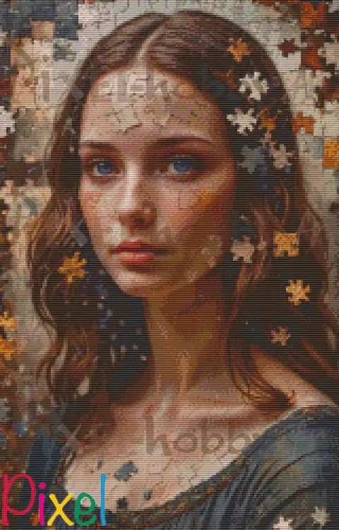 L'illustration revisitée de la Joconde présente une jeune femme aux yeux bleus captivants, dont le visage angélique et le regard mystérieux évoquent une profonde introspection.