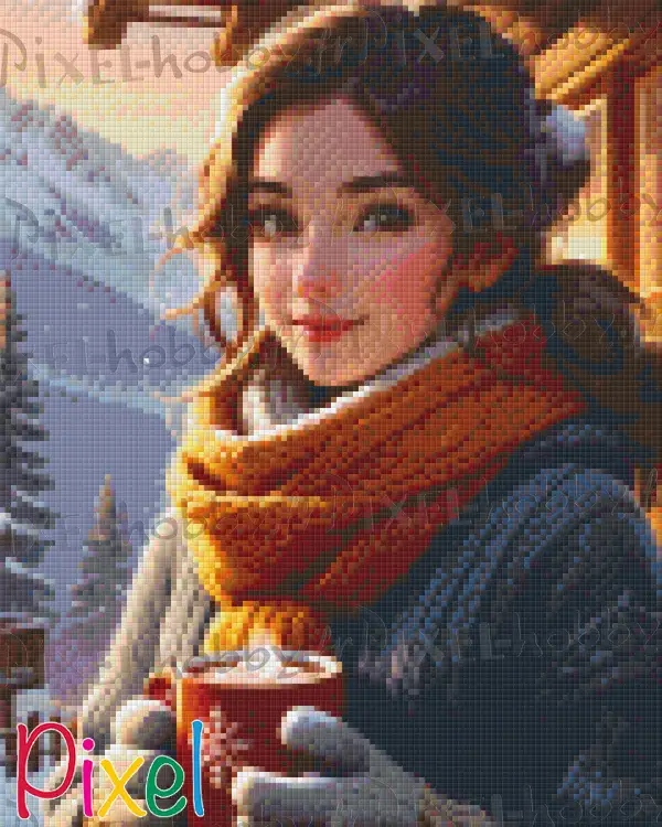 Son habillement, comprenant un pull en tricot bleu-gris aux motifs de câble et une écharpe jaune moutarde, évoque chaleur et confort, typiques des soirées d'hiver. Les gants qu'elle porte, avec ldes flocons de neige, soulignent une attention aux détails qui complète l’ensemble de sa tenue.