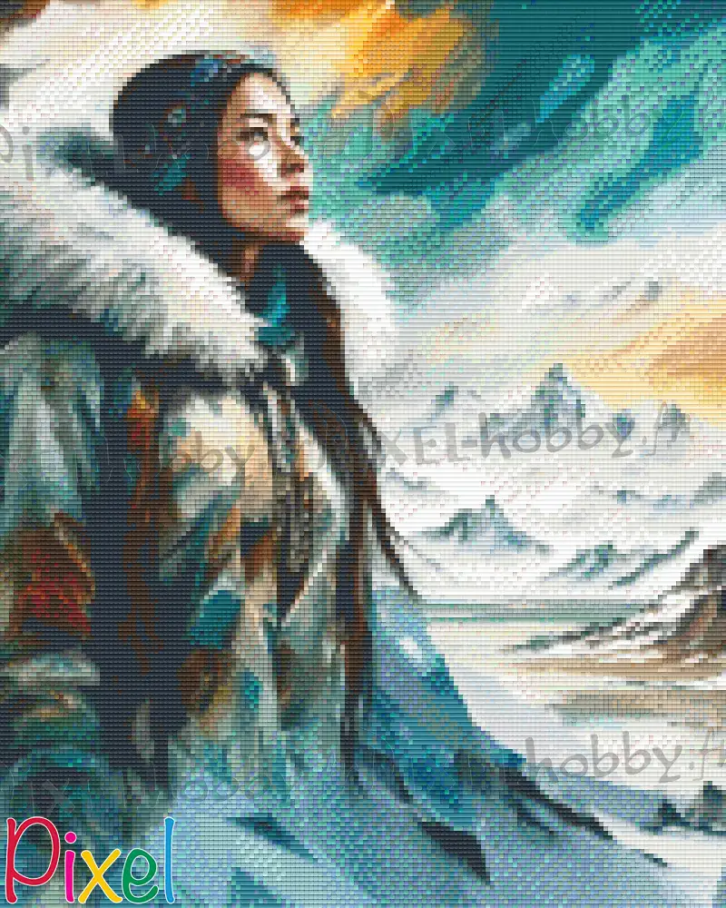 Les montagnes enneigées qui l'entourent représentent la grandeur et la majesté de la nature arctique, ainsi que la solidité et l'ancrage de la femme inuit dans sa culture et ses traditions. Le turquoise et le jaune du ciel évoquent la beauté et la pureté des paysages arctiques, tandis que les nuances de blanc des montagnes renvoient à la neige éternelle qui recouvre ces terres.