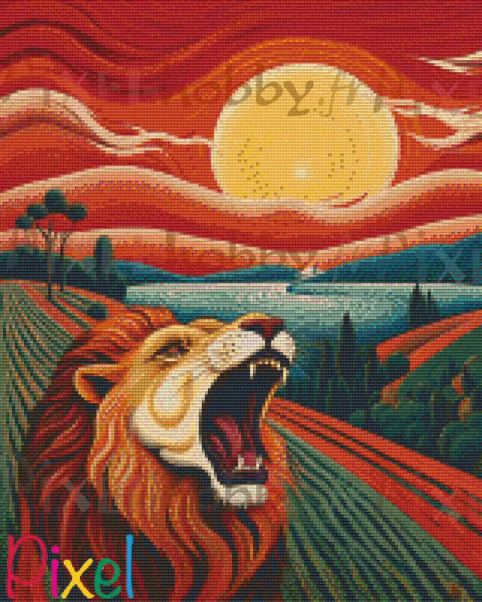 L'illustration est une revisite de l'œuvre emblématique "le Cri" d'Edward Munch, mais cette fois-ci, un lion est le personnage principal.