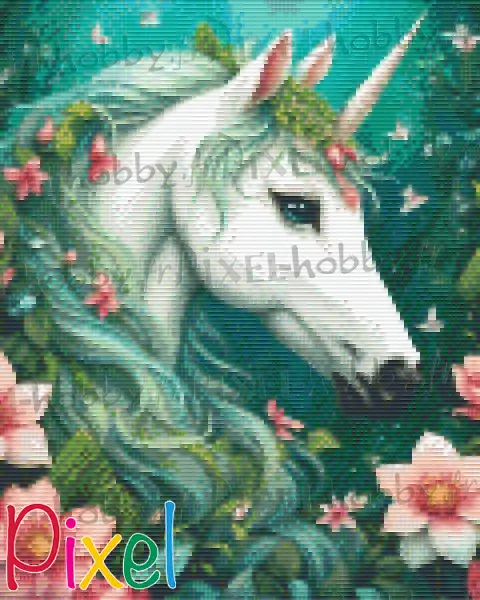 Sa crinière légèrement turquoise ajoute une touche de mystère, se mêlant harmonieusement aux petites fleurs qui l'ornent et qui semblent intimement liées à sa nature délicate.