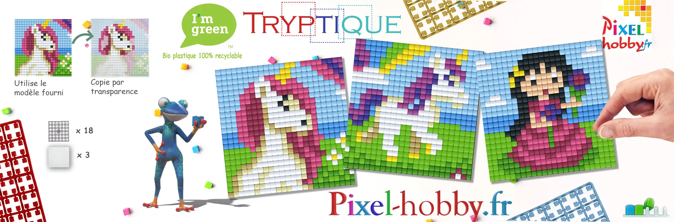 Kit pour la création de 3 carrés. Ce kit contient: 3 supports carrés 3 Modèles 18 carrés de pixels Il est possible de transformer les carrés en magnets (aimants vendus séparément). ..