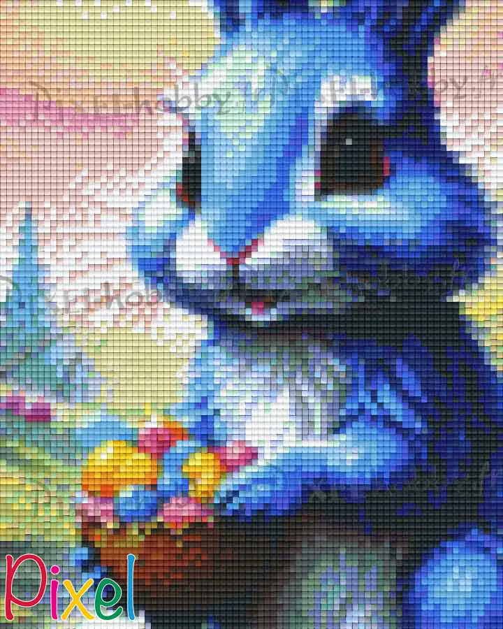 Ce kit est un illustration d'un charmant lapin bleu se tenant dans une forêt, près d'une rivière avec un panier d'œufs en chocolat dans ses mains.